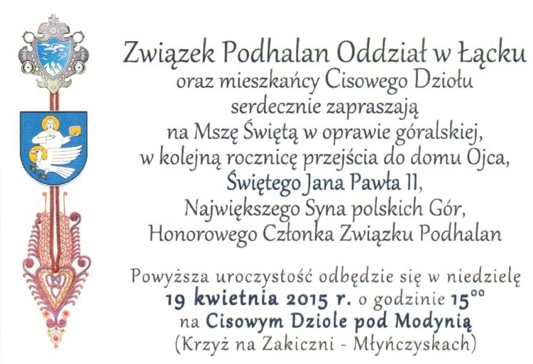 Doroczna, góralska msza święta pod krzyżem na Cisowym Dziale pod Modynią, upamiętniająca kolejną rocznicę śmierci Ojca Świętego Jana PawłaII, mimo dotkliwego zimna zgromadziła kilkuset wiernych. Była to nie tylko okazja do żarliwej modlitwy. Do tradycji, po zakończeniu nabożeństwa, należy wspólne biesiadowanie z góralską kapelą przy ognisku z pieczona kiełbasą i gorącym żurem.