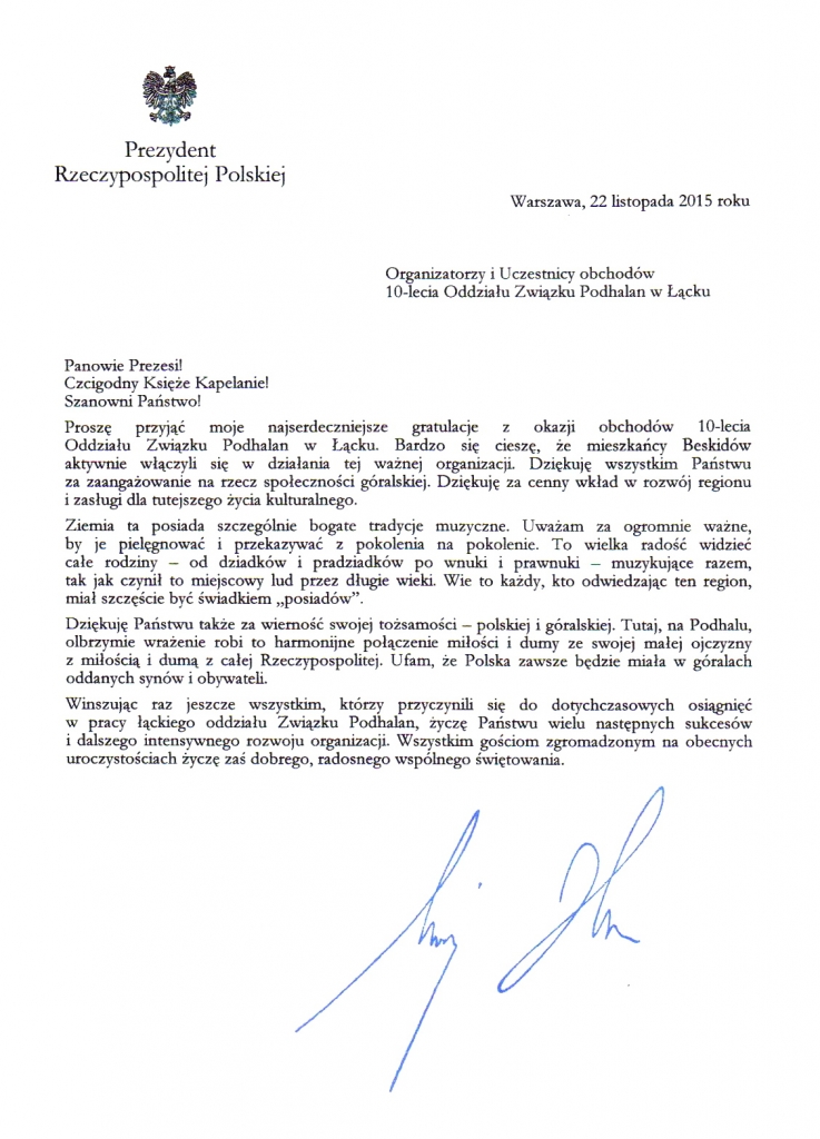 W dniu 22 listopada br. Związek Podhalan Oddział w Łącku obchodził 10-lecie istnienia. Jubileusz zorganizowany był wraz z Zoduskomi Muzykonckimi. Uroczystości odbywały się pod Honorowym Patronatem Prezydenta RP Andrzeja Dudy.