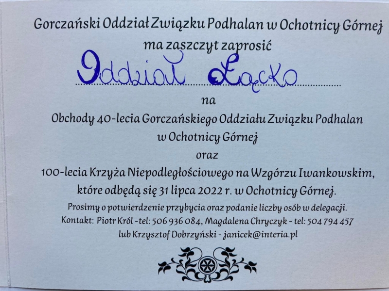 Zaproszenie na obchody 40-lecia Gorczańskiego Oddziału Związku Podhalan w Ochotnicy Górnej.